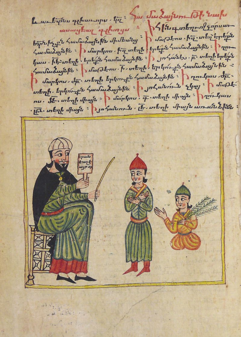 The miniature painting school of Vaspurakan is a quite original painting direction and the main period of its activities were the 15th – 16th centuries. Miniatures from Vaspurakan are rich with iconographic ancient compositions. Two main principles are dominant in Vaspurakan miniatures: symbolic and narrative. That is to say that in one case the iconographic scene is presented quite briefly, in an almost symbolic version, and in the other case in a quite narrative way, with more details. Manuscripts can be met in which these principles are used in parallel. In Vaspurakan miniatures scenes of real life can be seen, as, for instance, the miniature by Grigor Khlatetsi in which a scene of teaching is depicted (Matenadaran, Ms. 374, f. 14 r, fig.6).