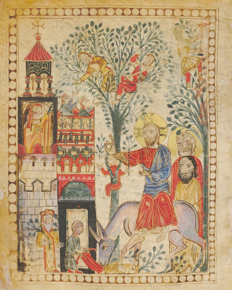 One of the significant works of Ani miniature painting is the Haghpat Gospel of 1211 (Matenadaran, Ms. 6288), decorated by painter Margare; its ornamentation, penetrated by profane spirit, is obviously bearing the seal of the urban milieu and the life ambiance of Ani. The painter pictured ordinary people, some of his fellow citizens in the margins of Canon Tables and in other miniatures. One of them is a youngster carrying a fish, called Sheranik, next to whom the painter wrote: “Sheranik, bring me a fish every time you come” (Fig.1). In the margin of another Canon Table a musician is depicted sitting under a pomegranate tree (Fig. 2). Greatly original is also the miniature depicting The Entry into Jerusalem in which the family of the manuscript’s receivers is portrayed as the people meeting Christ: the father is standing near the door of the building, the mother is seen from the window, the two daughters are on the balcony and the three sons on the trees (Fig. 3). The value of the Haghpat Gospel miniatures is inestimable for the history of the Armenian medieval art and urban culture.